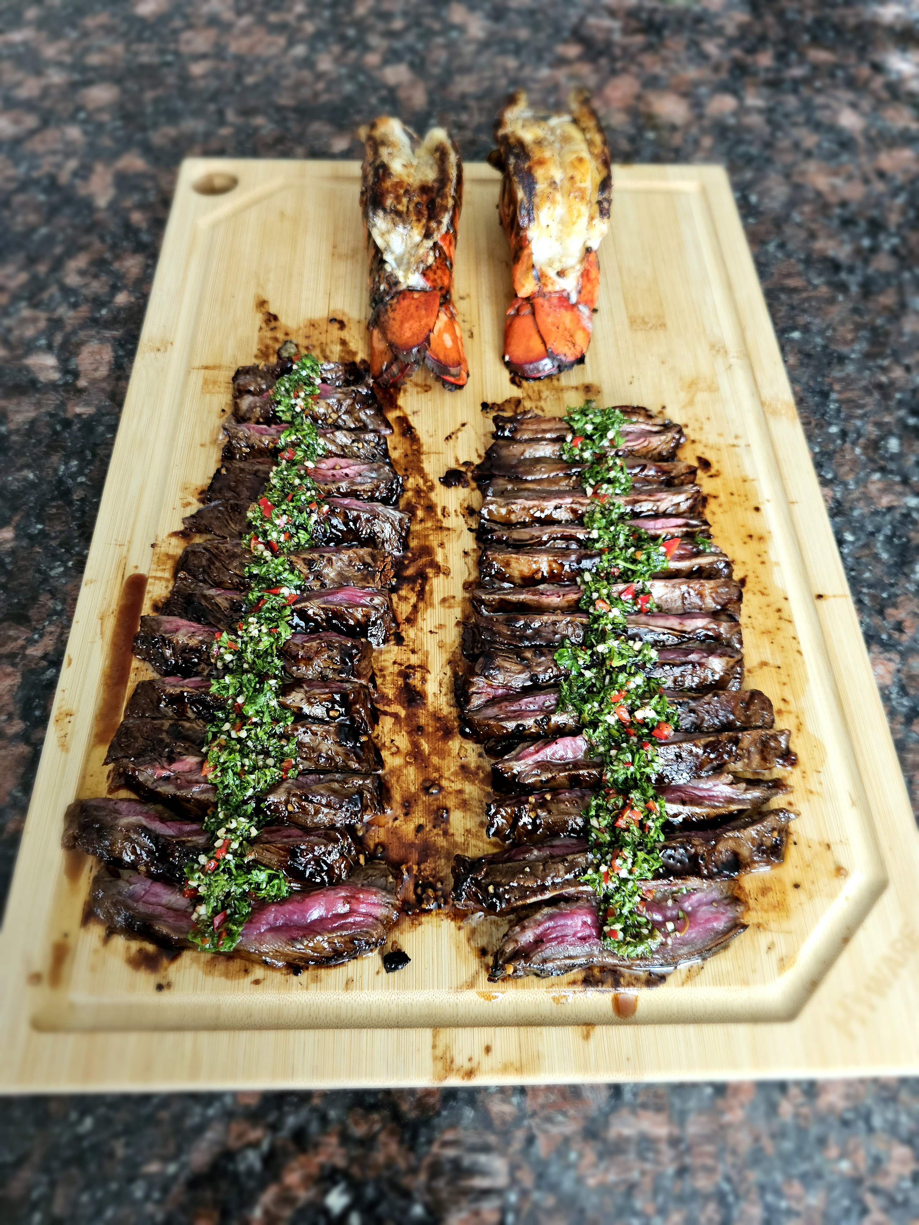 Serve the thinly sliced Marinated Grilled Flank Steak with a generous drizzle of Chimichurri sauce alongside the Grilled Garlic Lemon Butter Lobster Tail. This combination of flavors will make for a memorable and delicious meal. Enjoy!
